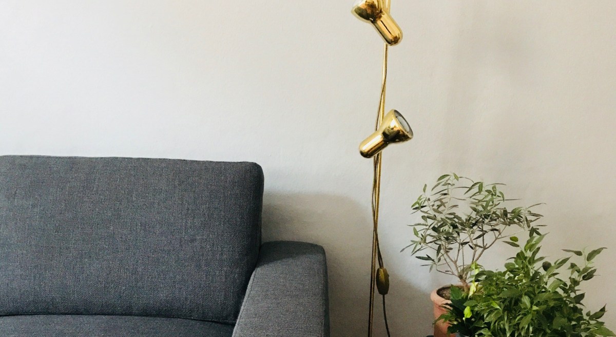 Wohnzimmer / Couch grau / Stehlampe Gold